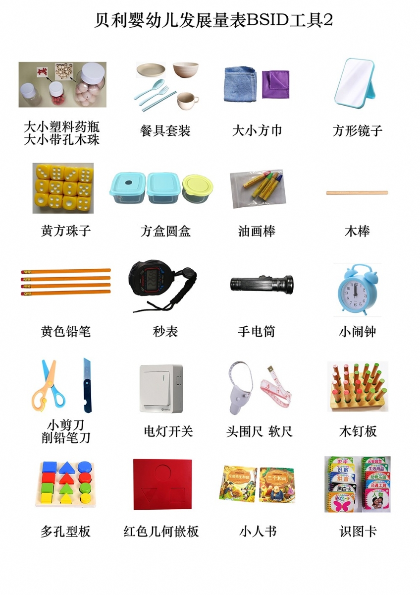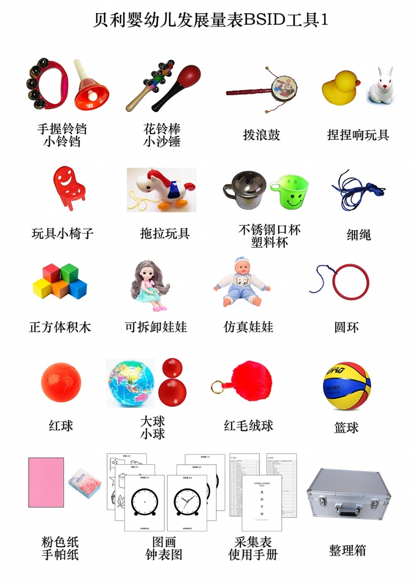 手握鈴鐺、小鈴鐺、花鈴棒、撥浪鼓、小沙錘、捏捏響玩具、玩具小椅子、拖拉玩具(帶線)、小正方體積木(紅12個,黃藍綠各2塊)、可拆卸娃娃、布娃娃、圓環(huán)、紅球、大球、紅毛絨球、籃球、紅色小球、細繩、不銹鋼口杯、塑料杯、大號塑料藥瓶、小號塑料藥瓶、餐具套裝、大小方巾、方形鏡子、大木珠(帶孔)、小木珠(帶孔、)黃方珠子、塑料方盒、塑料圓盒、油畫棒、指揮棒、黃色鉛筆、秒表、手電筒、小鬧鐘、電燈開關(guān)、頭圍尺、軟尺、木釘板、多孔型板(含圓形、方形、三角形各4塊)、幾何嵌板(含圓、三角、方形,厚8mm)、小人書識圖卡(果蔬、人物、動物、交通等)、粉色卡紙、手帕紙、鐘表圖1234、圖畫12(BSID)、BSID采集表、BSID使用手冊、整理箱等。