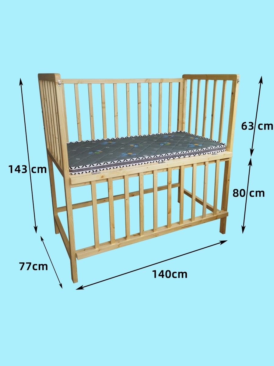 長(zhǎng)140cm,寬77cm,高143cm,欄高63cm。一側(cè)護(hù)欄可開合,配備床墊。