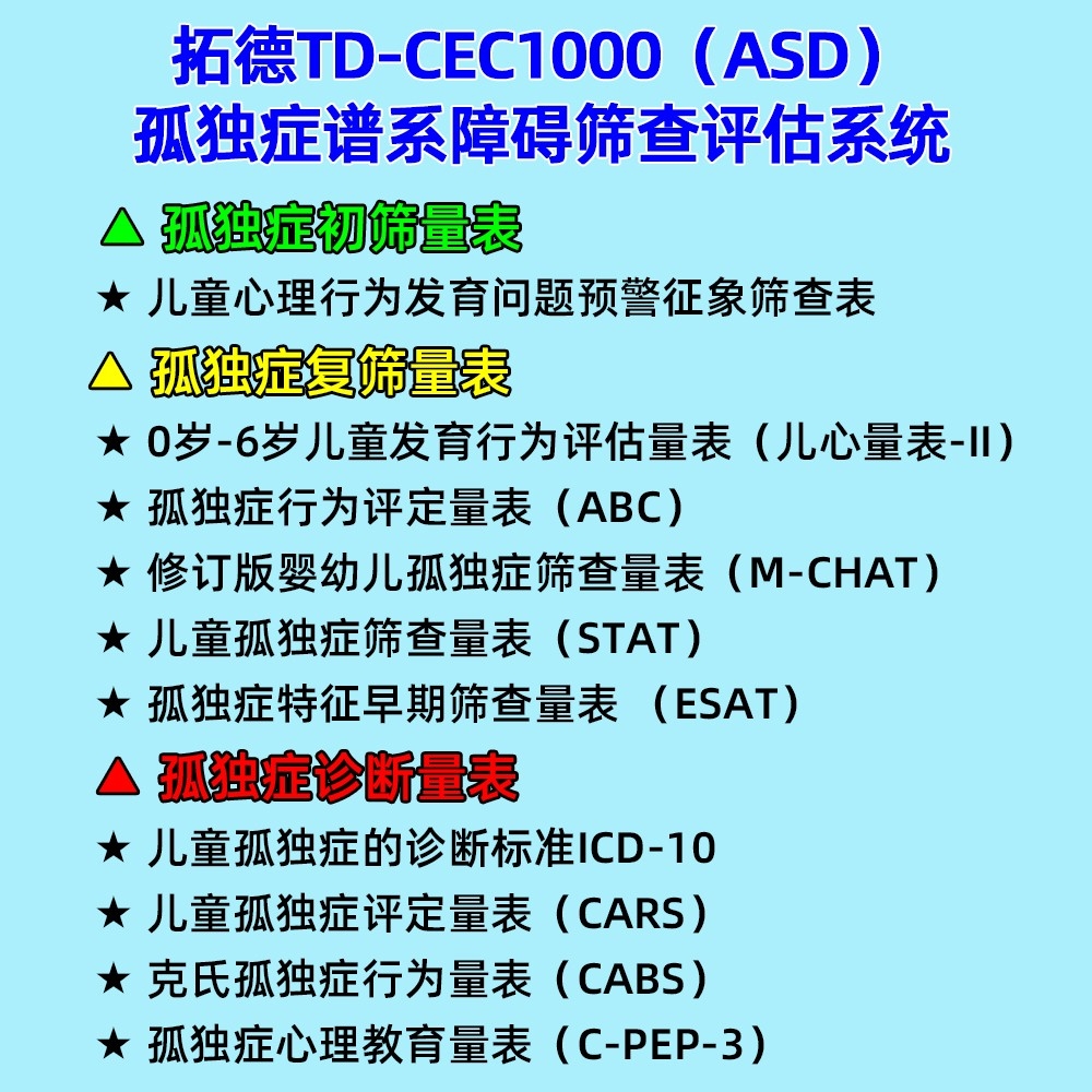 • 拓德0-6歲孤獨(dú)癥譜系障礙篩查評估系統(tǒng)ASD心理教育量表CPEP3